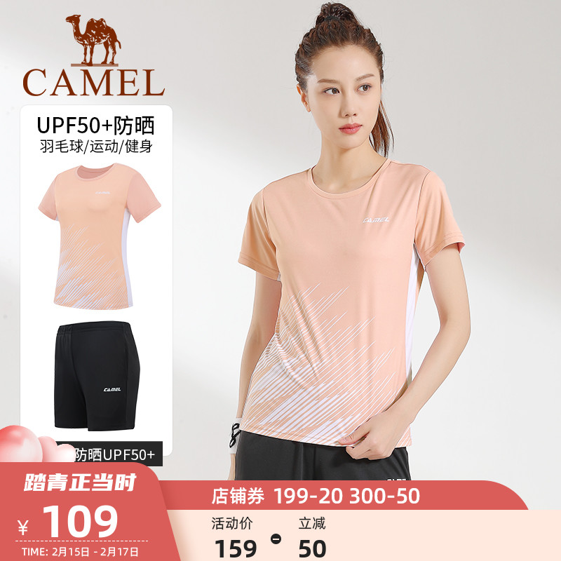 骆驼女装速干圆领t恤女夏季新款短袖印花半袖透气弹力上衣潮